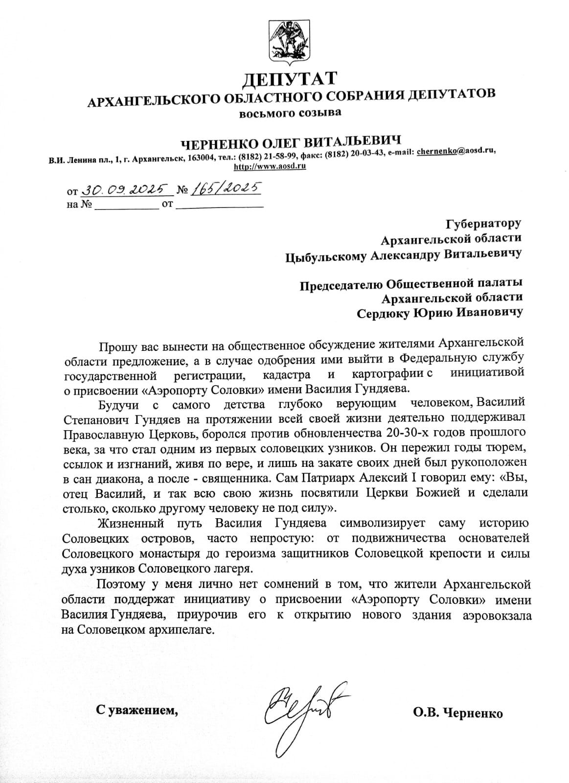 Председатель Совета регионального отделения Партии СПРАВЕДЛИВАЯ РОССИЯ – ЗА ПРАВДУ в Архангельской области, руководитель партийной фракции в Архангельском областном Собрании депутатов Олег Черненко выступил с инициативой о присвоении "Аэропорту Соловки" имени Василия Гундяева.
