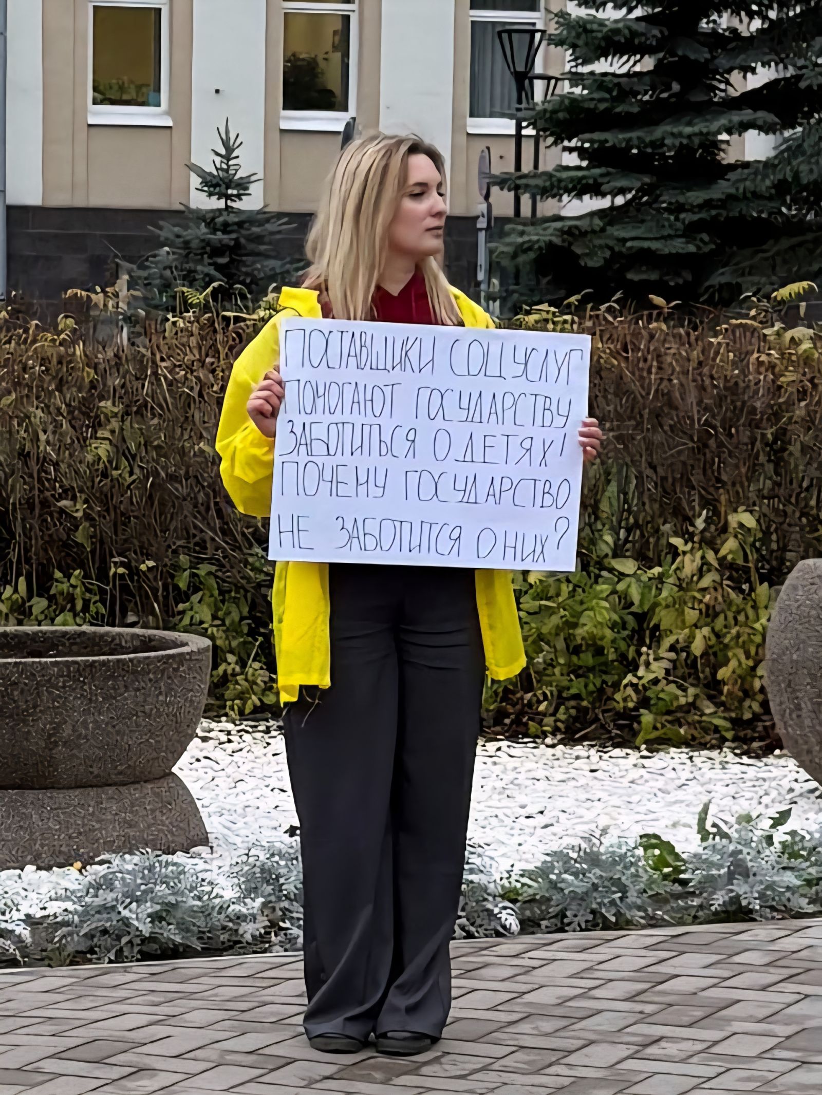 "После моих публикаций об угрозе закрытия в Архангельской области организаций-негосударственных поставщиков социальных услуг, пообщавшись с женщинами, чьи дети пострадают от этого, и как мать, проникнувшись их болью, моя помощница Анастасия Корнюх вчера вышла с одиночным пикетом к зданию регионального правительства.