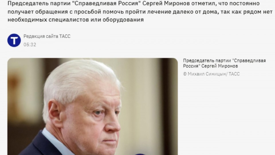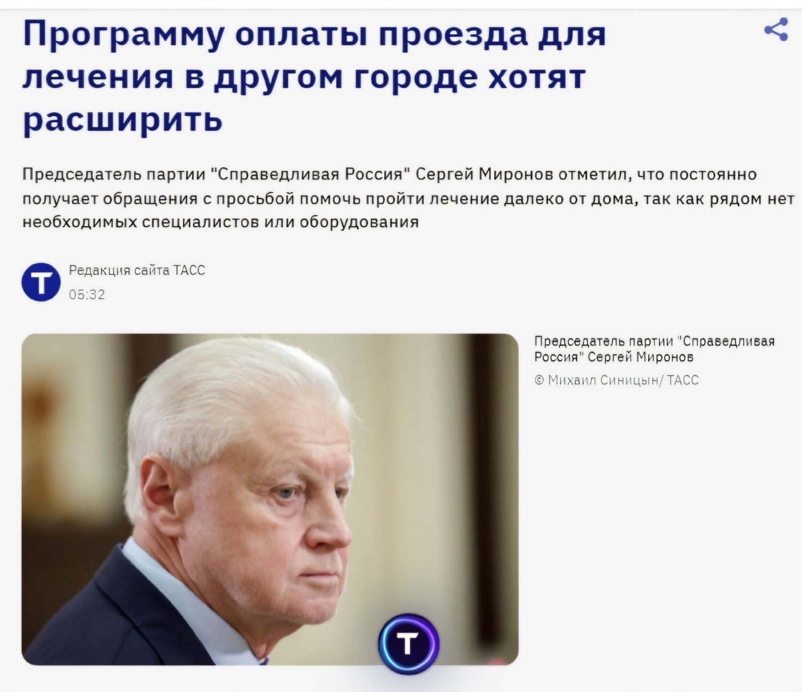 Вчера информационное агентство ТАСС опубликовало обращение Председателя Партии СПРАВЕДЛИВАЯ РОССИЯ, руководителя партийной фракции в Госдуме Сергея Миронова к Минздраву о запуске общероссийской программы по компенсации расходов на проезд и проживание для граждан, которые едут лечиться в другой город.