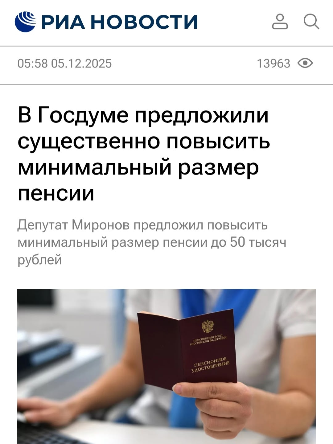– Повышение минимальной пенсии до 50 тысяч рублей позволит обеспечить достойный уровень жизни, поддержать здоровье и активность представителей старшего поколения, – уверен Председатель Партии СПРАВЕДЛИВАЯ РОССИЯ, руководитель партийной фракции в Госдуме Сергей Миронов.