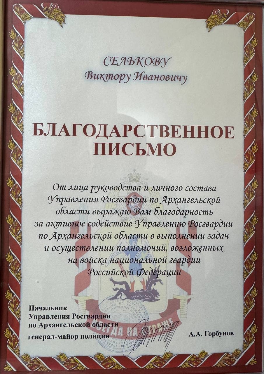 В рамках памятного мероприятия, посвященного празднованию Дня Героев Отечества, начальник Управления Росгвардии по Архангельской области генерал-майор полиции Андрей Горбунов вручил благодарственное письмо за оказанную помощь участникам специальной военной операции депутату Архангельской городской Думы от Партии СПРАВЕДЛИВАЯ РОССИЯ, ветерану войск правопорядка Виктору Селькову.