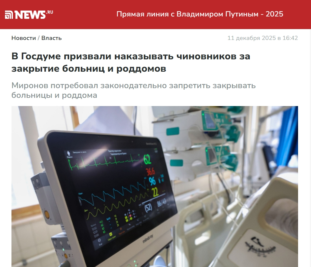В этой связи очень актуально выступление лидера СПРАВЕДЛИВОЙ РОССИИ: Сергей Миронов потребовал законодательно запретить закрывать роддома и больницы, а также призвал наказывать за это чиновников.