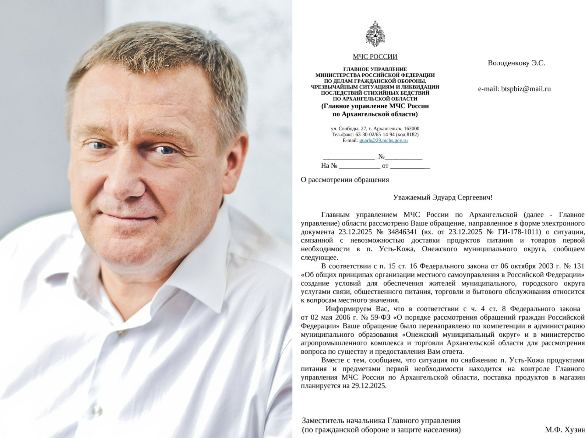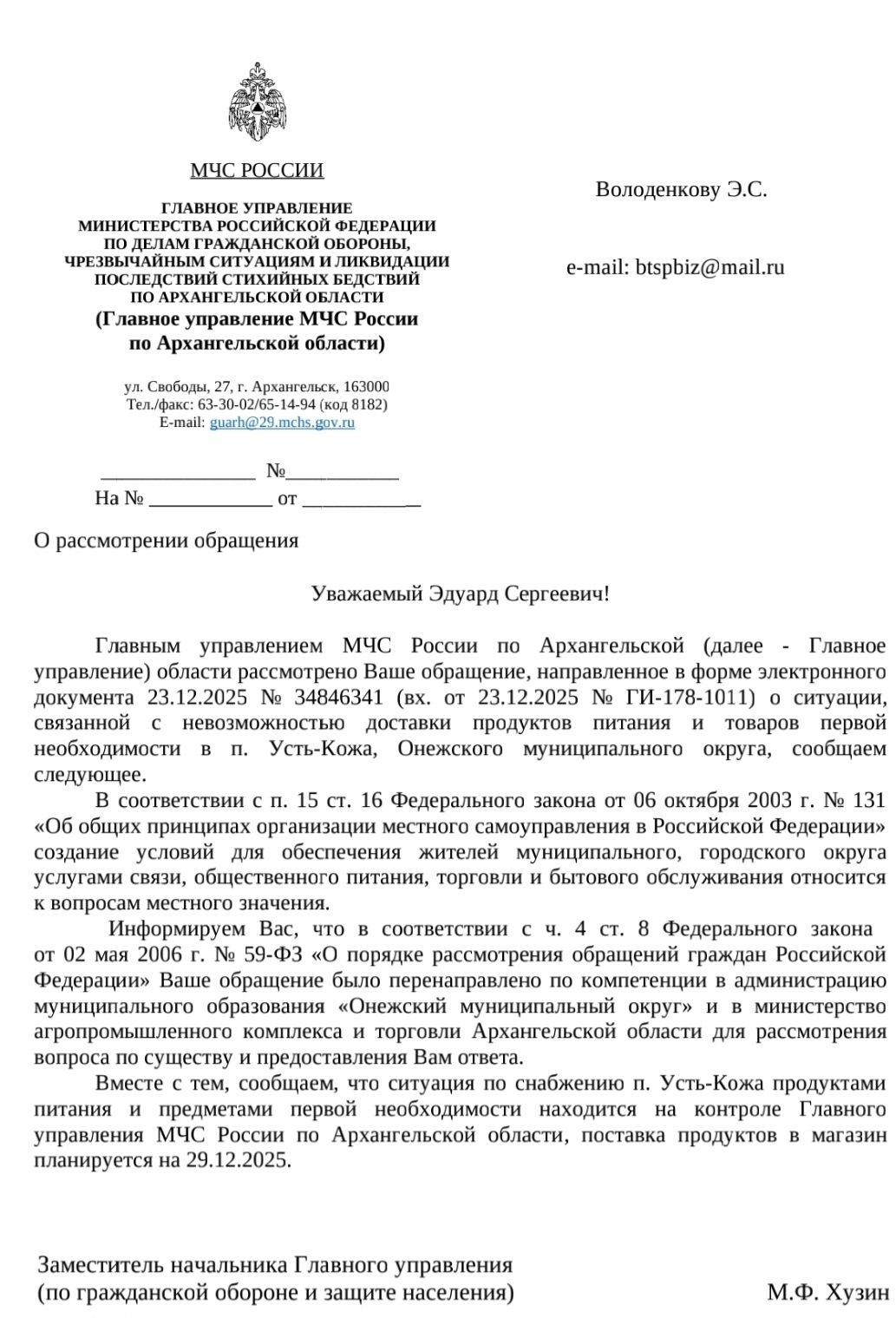 В официальном письме Главное управление МЧС России по Архангельской области подчеркнуло, что хотя снабжение населения – это зона ответственности местной администрации, ведомство держит ситуацию на контроле и запланировало поставку продуктов на 29 декабря. А обращение народного избранника-справедливоросса было перенаправлено в Министерство АПК и торговли, а также в Онежскую окружную администрацию.